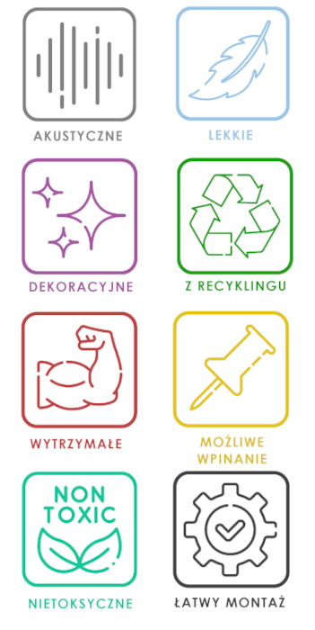Filc wykorzystywany do produkcji paneli nie wydziela lotnych związków organicznych. Jest całkowicie antyalergiczny, nietoksyczny i niedrażniący, dlatego z powodzeniem może być stosowany także w pokojach dziecięcych!